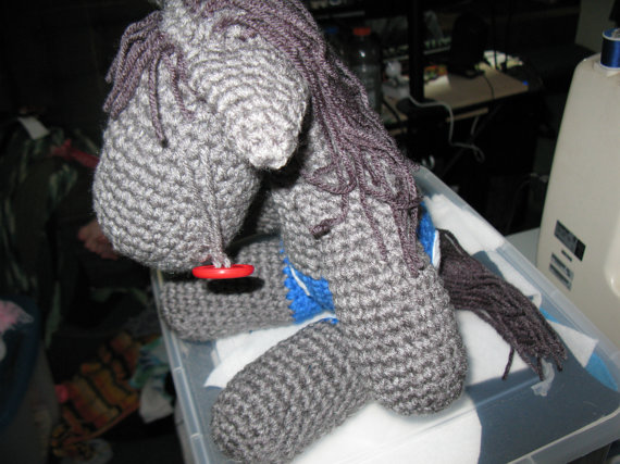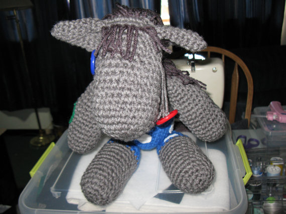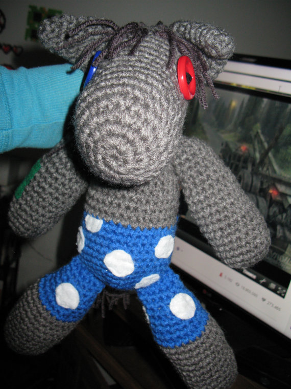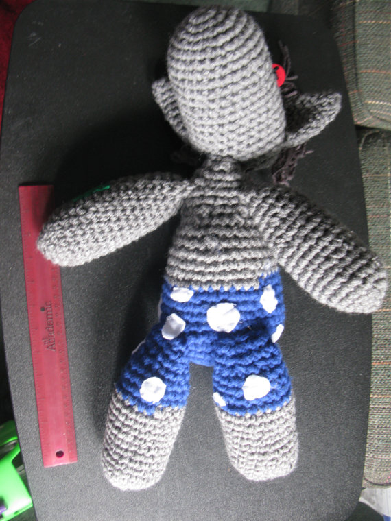 It will be lovingly crocheted out of acrylic yarn. The dots on the pants and the "patch" will be made from acrylic felt. I can make the eyes either buttons or crocheted. In the pictures shown, they are buttons. If they were crocheted, they would be made out of yarn instead.