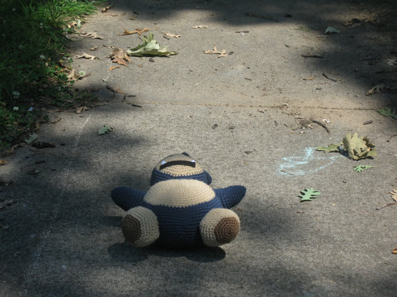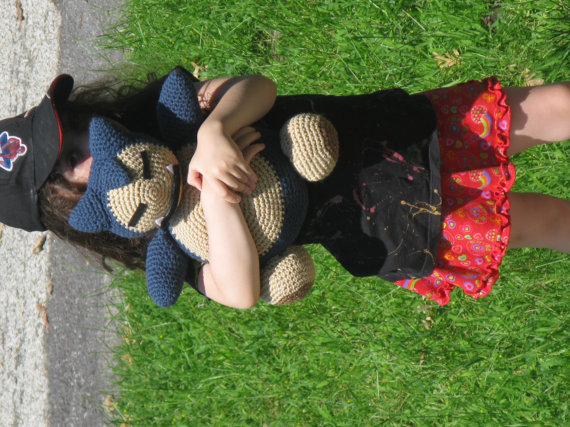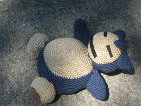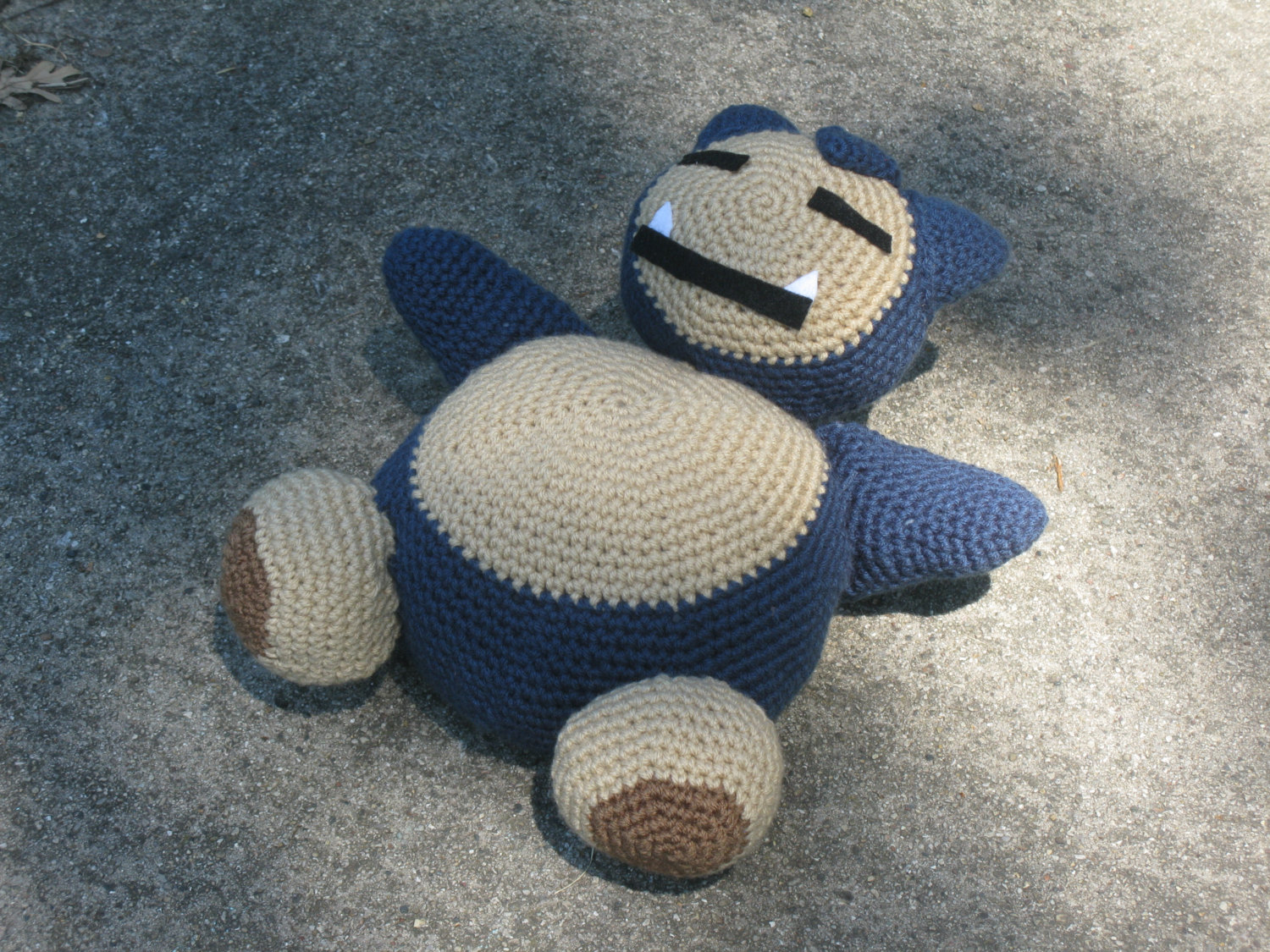 Hand crocheted with yarn and love, stuffed with hypoallergenic polyfill, and with eyes and a mouth made of felt; Snorlax will be 14" from toe to ear and 12" wide from finger tip to finger tip. He will be ready to cuddle and block paths all over your neighborhood.