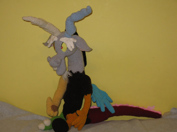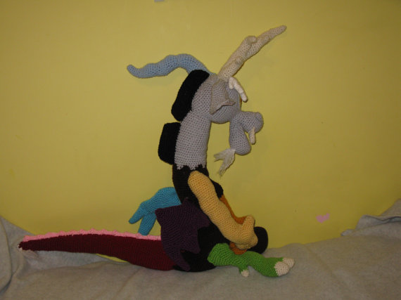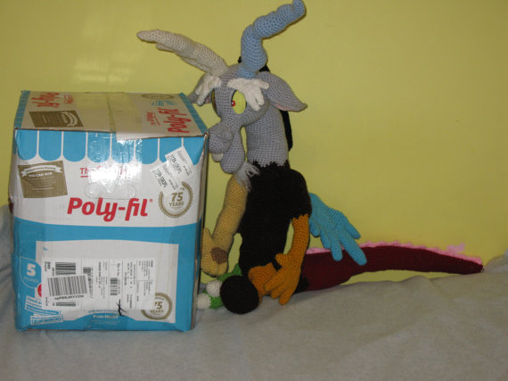 This is a giant crocheted Discord plush. All of the yarn is 100% acrylic. He is stuffed with 100% polyester fiber fill. His eyes are embroidered.