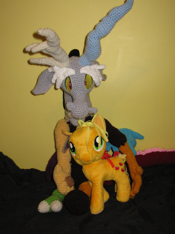 He sits about 32" tall including his horns. His tail stretches out about 20", but it can be folded up against him or held by his arm. For scale, that's a 5lb box of Poly-fil and a Funrise 10" Applejack. He is the perfect size to sit next to 10 - 16 inch ponies! .