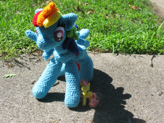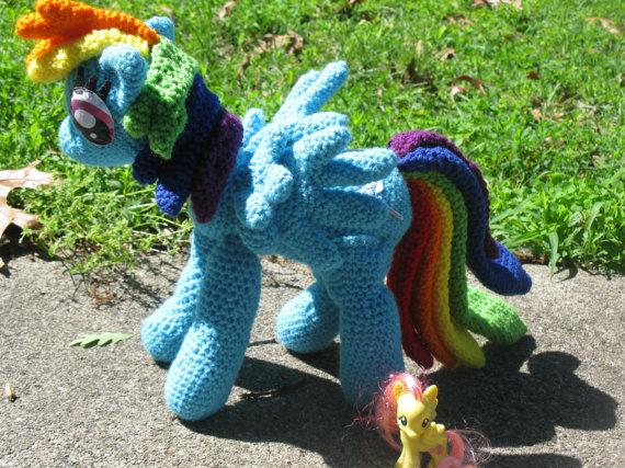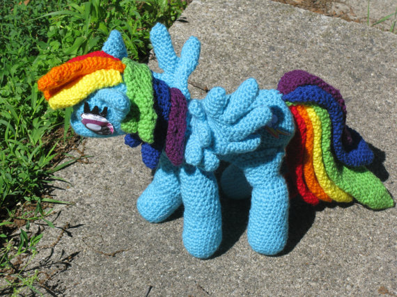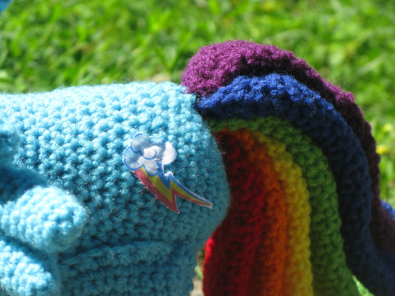 Rainbow Dash will be crocheted so that your home can become 60% cooler! Made with yarn, love, and a little bit of embroidered felt (for the eyes and cutie marks), Rainbow Dash will stand about 15 inches tall. No wires means she is cuddleable, but she still stands on her own. However gentle cuddling is recommended and she must be spot cleaned only. Not recommended for young children; put it on display on a shelf until they are old enough to care for it ^_^
