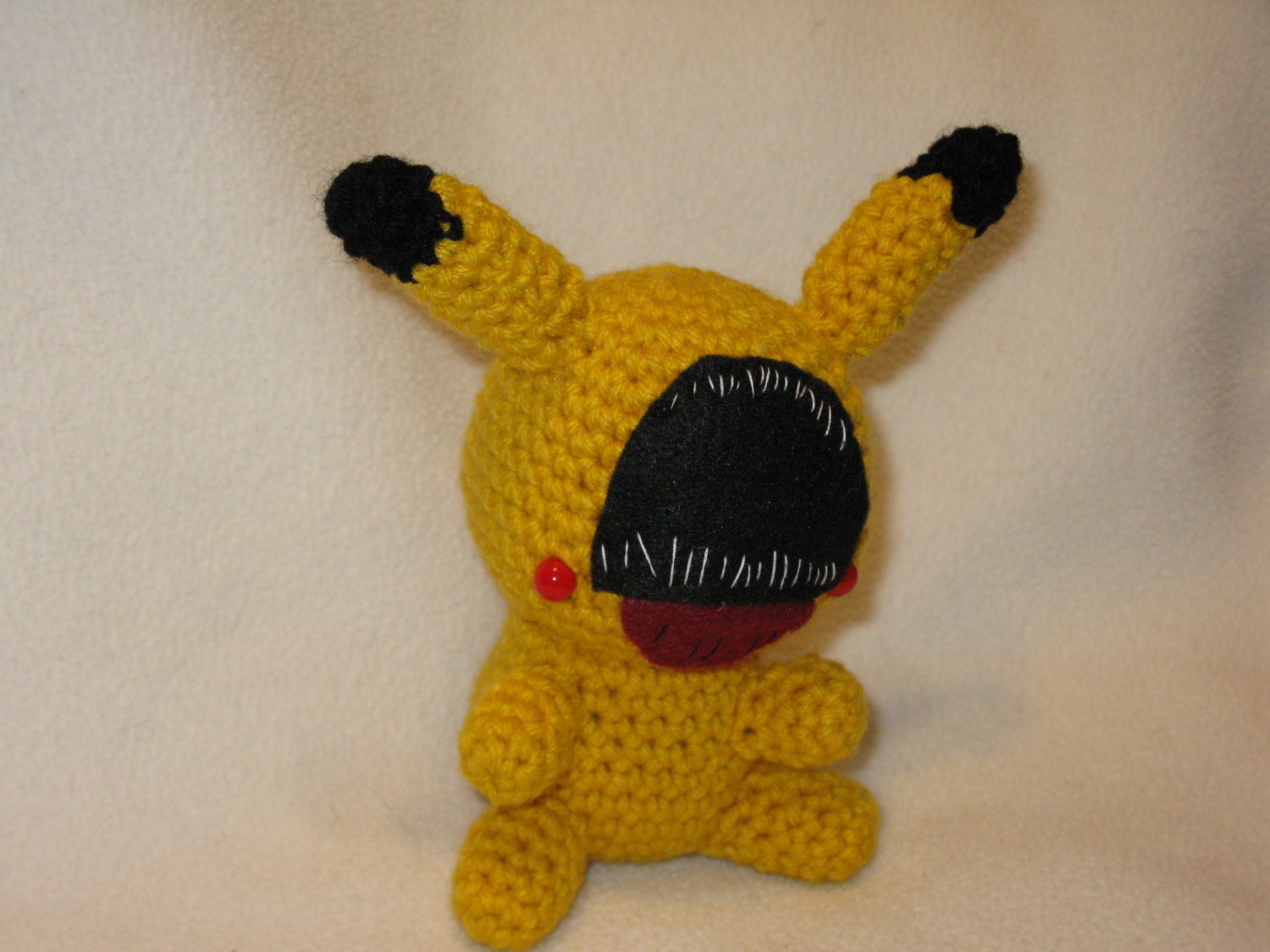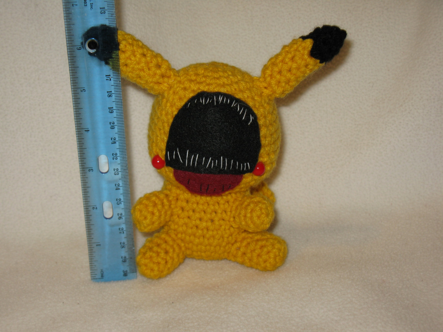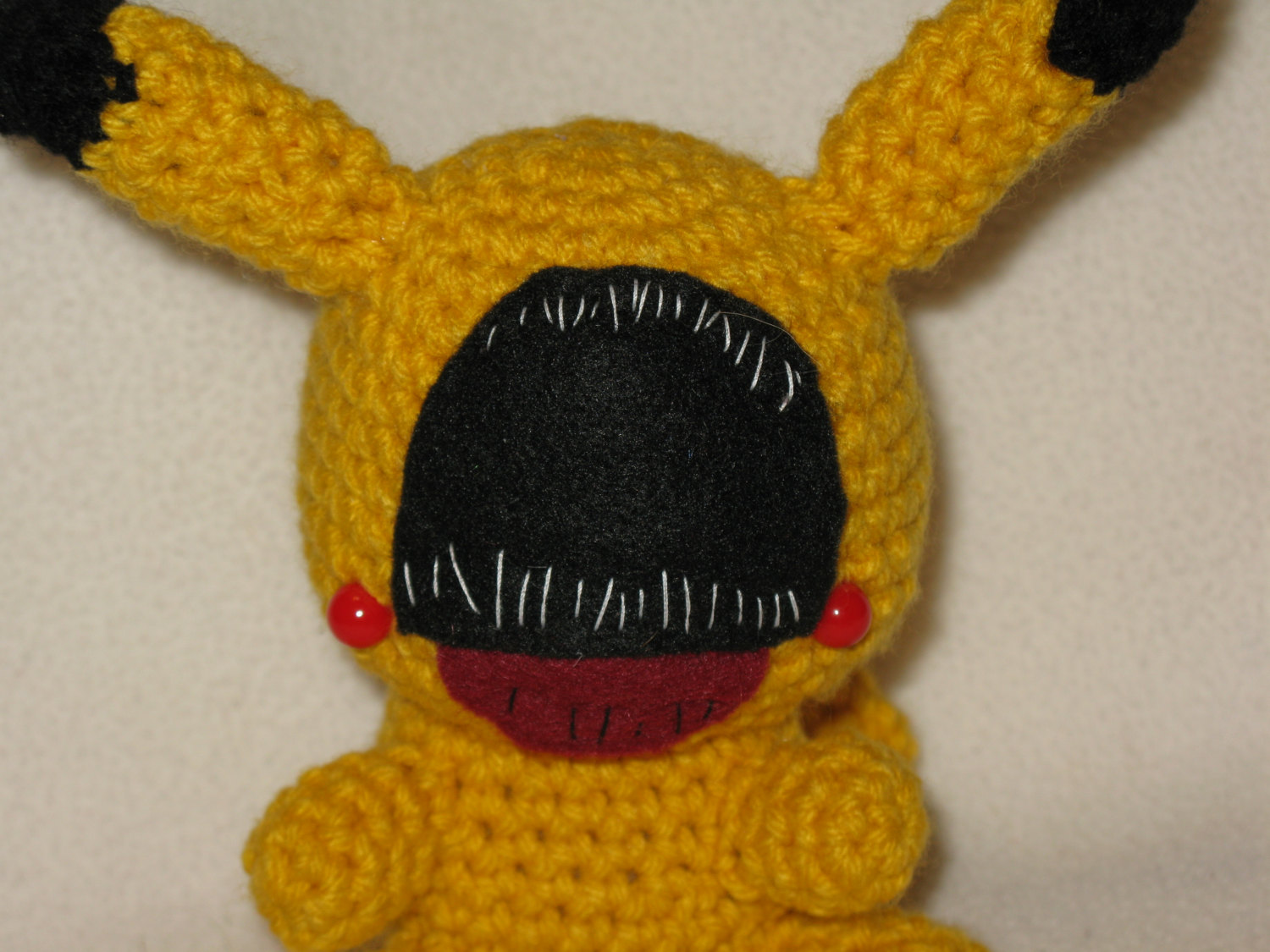 Made just for you with love, acrylic yarn, and safety eyes, your Chibi Glitch Pikachu will be about 6 inches tall. Each face will vary slightly.